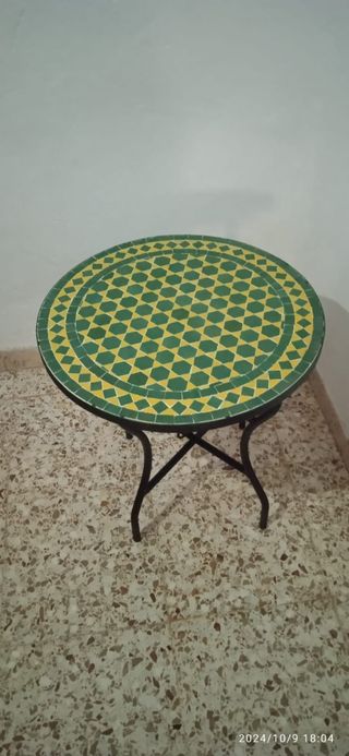 Bellissimo tavolino in stile marocchino. Ideale per interni o esterni. Superficie in ceramica con un design unico. Struttura in ferro resistente e decorativa. Perfetta per qualsiasi spazio.