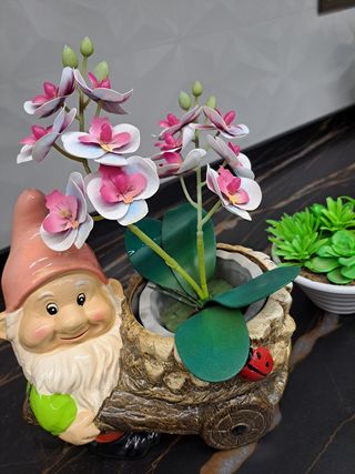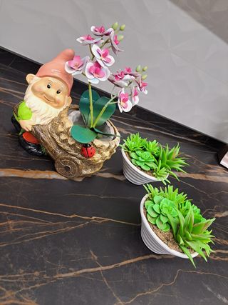 Preziose piante artificiali e un incantevole gnomo in ceramica per decorare il tuo giardino o qualsiasi spazio esterno. Sono ideali per dare un tocco di colore e originalità alla tua casa. - Include un gnomo portavasi e due vasi con piante grasse artificiali. - Lo gnomo è in ceramica e le piante sono in plastica. - Perfetto per decorare tavoli, balconi o scaffali.