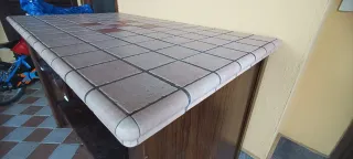 Piano di lavoro con finitura in ceramica e pietra, ideale per dare un tocco di stile alla tua cucina o al tuo spazio. Ideale sia come isola.in cucina sia in portici e esterni giardino. - Rivestimento del top è in ceramica e pietra. - La struttura è in ferro - Colore beige e marrone.