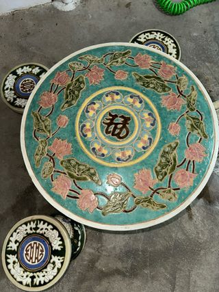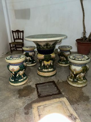 Vendo un set molto speciale composto da un tavolo in ceramica e 4 sgabelli decorativi a forma di elefante. È un set robusto, pesante e molto appariscente, ideale per patii, terrazze, giardini o aree relax. La ceramica è in buono stato e conserva i colori vivaci. Include anche una figura di elefante in ceramica indipendente, perfetta come decorazione o come mini sgabello/tavolino.
