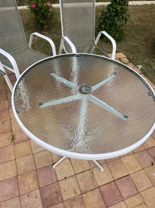 Tavolo da giardino con superficie in vetro e base in metallo. - Design moderno ed elegante. - Ideale per uso esterno. Il tavolo in vetro e ferro con 4 sedie 2 è rotto a causa dell'usura, motivo per cui il suo prezzo misura 70 cm di altezza e 60 cm di diametro.