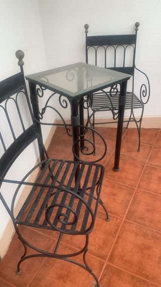 Set di tavolo e due sedie in ferro battuto con piano in vetro. Design elegante con dettagli curvi. Gambe in metallo con protezioni. Piano in vetro.