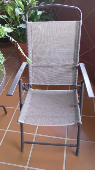 Set di tavoli e sedie per terrazzo. Struttura in metallo. Alluminio, 15€ a tavolo e 10€ a sedia.