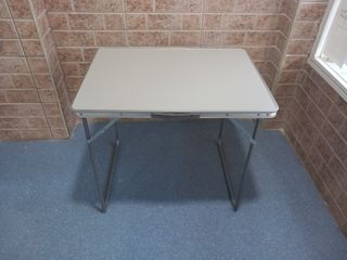 Tavolo pieghevole pratico e facile da riporre. Struttura in metallo resistente. Superficie in plastica duratura.