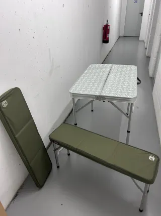 Set di tavolo e sedie pieghevoli, perfetto per il campeggio o l'uso all'aperto. Facile da montare e trasportare. - 2 tavoli con superficie in legno. - Sedie con struttura in metallo e sedili in tessuto. - Include 8 sedie e 4 sgabelli. - L'intero set costa 50 euro. - Possono essere acquistati separatamente, prezzo da concordare.