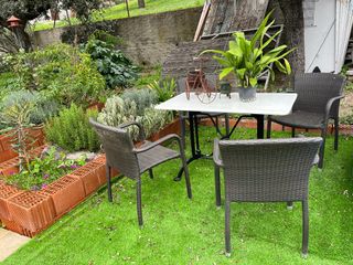 Panca da giardino in legno e ghisa per giardino: i tavoli dovrebbero essere verniciati. Oppure cambiali e torneranno come nuovi. Non conosco le misure ora. Puoi mettere barre rettangolari in acciaio anziché assi di legno. Attualmente è smontato.