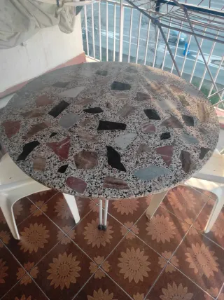 Tavolo con design a mosaico per la tua terrazza o balcone. Base con gambe in ferro battuto molto resistente. Dimensioni 120 x 80 cm. Piano con intarsi in marmo e dettagli in bianco. Come nuovo, quasi non utilizzato, sempre stato in terrazza chiusa protetta dalle intemperie.