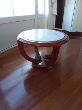 Tavolino elegante con piano in marmo e struttura in legno. Come si può vedere nelle foto, è in perfette condizioni. - Design rotondo e classico. - Base in legno con dettagli intagliati. - Piano in marmo venato.