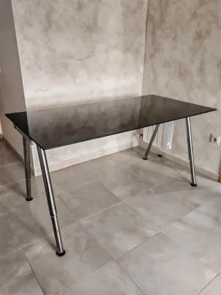 Tavolo elegante con piano in cristallo nero e gambe in acciaio inossidabile. Design moderno e minimalista. Gambe regolabili in altezza. Superficie liscia e facile da pulire. In buone condizioni, con segni d'uso logici. Nuovo, costo 500€.