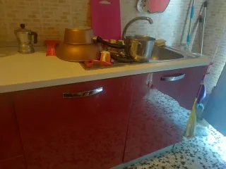 Arredo cucina completo con mobili e piano. - Mobili con ante color rosso. - Piano di lavoro bianco. - Lavello in acciaio inox. - Piano cottura a gas.