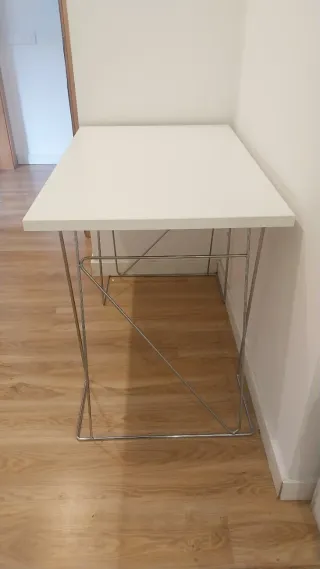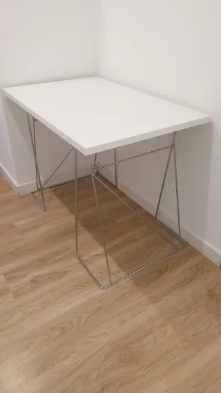Tavolo costruito con supporti in acciaio inossidabile e piano bianco in regalo. Il piano non è rifinito su uno dei lati corti. Si vendono i 2 supporti e il piano è in regalo. - Piano in legno bianco. - Gambe in metallo argentato con design geometrico.