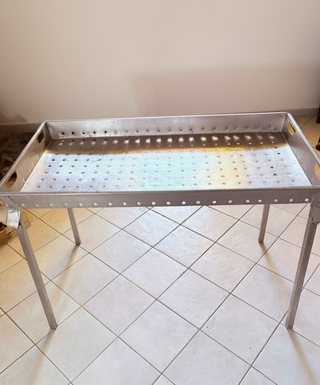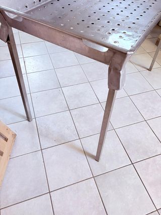 Vendo robusto tavolo professionale in acciaio inox, ideale per cucine industriali, laboratori, settore alimentare o attività artigianali. Il piano superiore forato è perfetto per facilitare la scolatura, la lavorazione di prodotti freschi o come piano d’appoggio aerato. La struttura è solida, stabile e costruita per durare nel tempo, garantendo la massima igiene e facilità di pulizia. Dimensioni: altezza 90 cm x lunghezza 125 cm x profondità 67 cm