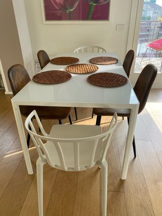 Tavolo Allungabile Zoom Kartell Bianco con qualche segno sul cristallo Misure lunghezza 160 cm (allungabile fino a 250) e larghezza 85 cm Struttura alluminio vernicato bianco e piano cristallo retroverniciato bianco, Ritiro a Milano
