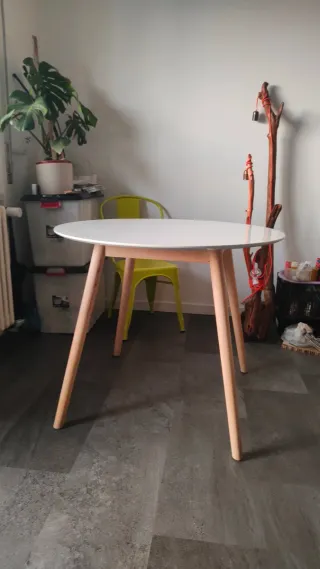 Elegante tavolo rotondo con piano bianco e gambe in legno. Perfetto per quattro persone. Ottimo per spazi piccoli pur rimanendo capiente. Piccoli punti di usura come da foto - Piano del tavolo in finitura bianca lucida. - Gambe in legno naturale.