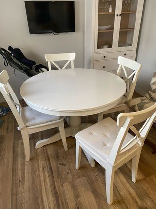 Tavolo da pranzo rotondo Ikea. Modello Ingatorp estensibile laccato bianco. Misure 110 cm di diametro estensibile a 155 cm. Piccolo difetto in superficie come mostrano le foto. Sono a Ruzafa, Valencia.