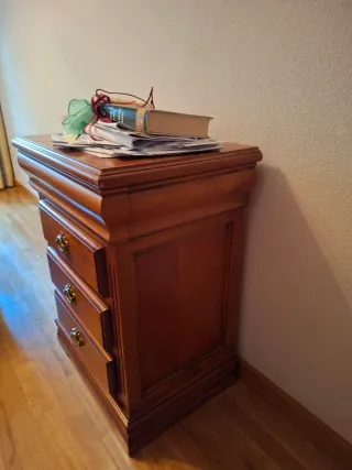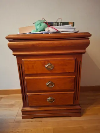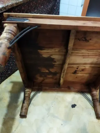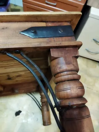 Comodino in legno massello con ante frontali e dettagli in ferro battuto. Un pezzo con carattere, perfetto per dare un tocco rustico o tradizionale a qualsiasi angolo della casa. Caratteristiche Struttura solida in legno invecchiato Ante con cerniere e chiusura decorativa in ferro Gambe tornite con traverse Stile rustico, tradizionale o castigliano Ideale come comodino, ausiliario in salotto o mobile decorativo Misure approssimative: 50 cm x 32 cm x 52 cm In buone condizioni (ha un maniglione rotto)