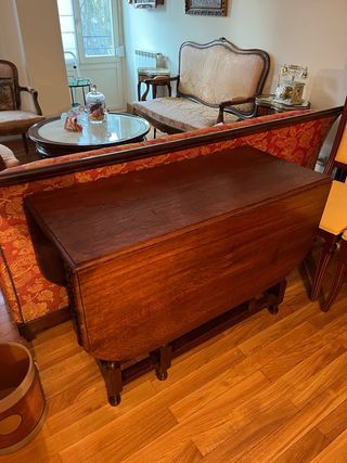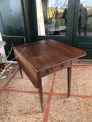 Tavolo elegante con ali pieghevoli in stile classico. Perfetto come tavolo ausiliario per spazi ridotti grazie al suo design pieghevole. In legno massello con fini dettagli di intarsio, dispone di un cassetto frontale con due maniglie metalliche originali e chiave centrale. Può essere utilizzato con entrambe le ali chiuse (come consolle), con una aperta o con entrambe per raddoppiare la superficie di appoggio. Si presenta in buone condizioni generali di conservazione. #antigüedad #tavoloausiliare #mobileclassico #intarsio #retro #stileinglese.