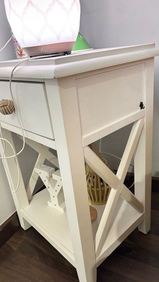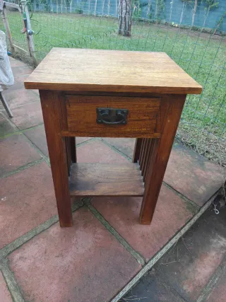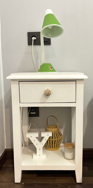 Con due altezze, composto da un ripiano inferiore e un cassetto rettangolare sotto il piano. Questo mobile sarà il tuo alleato perfetto in camera da letto, se cerchi un mobile funzionale e di tendenza. In legno massello. Niente plastica o tessuti. Misure: Altezza 63 cm · Larghezza 43 cm · Profondità 34 cm. Stato: Perfetto, senza graffi, macchie o altri difetti.