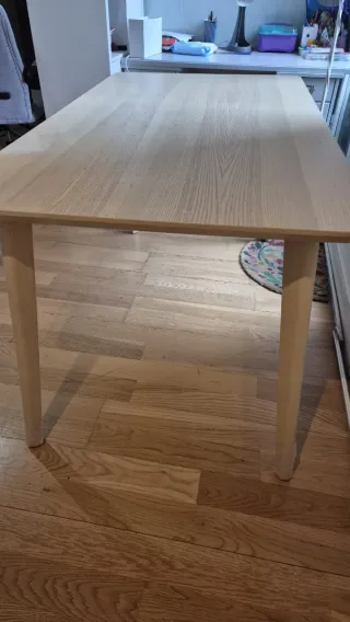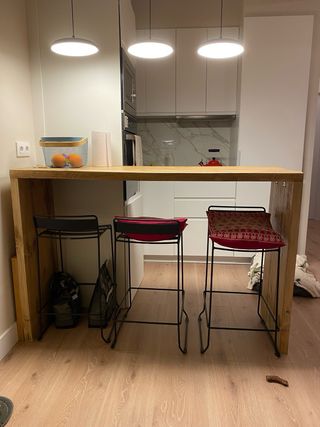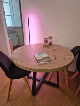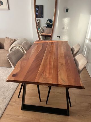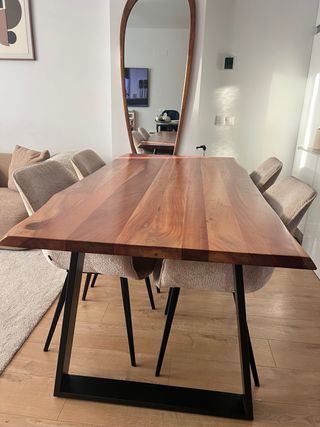 Tavolo da pranzo con design moderno e funzionale. Si vende per motivo di trasloco. Disponibile fino al 27 gennaio a Barceloneta. È possibile vendere le sedie. x4 Non accettiamo pagamenti tramite altre aziende. - Piano in legno. - Gambe in metallo.