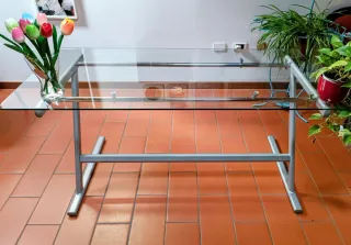 Elegante scrivania con piano in vetro e struttura in acciaio. - Design moderno e minimalista. - Materiali resistenti e durevoli.