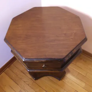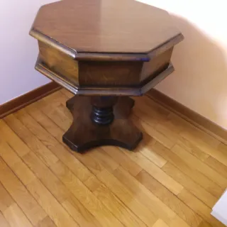 Elegante tavolino in legno con finitura noce, risalente agli anni '70-'80. Il suo design ottagonale e la base a piedistallo lo rendono un pezzo d'arredo distintivo. - Forma ottagonale del piano. - Base a piedistallo con elementi decorativi. - Finitura in legno di noce.in perfette condizioni cm44x44x48h