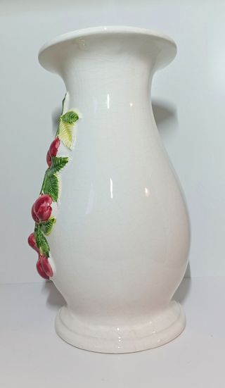Vaso decorativo in ceramica bianca, con motivi fruttati in rilievo di ciliegie rosse e foglie verdi, stile artigianale italiano. Forma elegante a bulbo, perfetto per fiori o arredamento. **Dettagli del prodotto:** - Altezza: circa 29 cm, circonferenza massima 52 cm (diametro 16.5 cm). - Materiale: ceramica smaltata, decorazioni dipinte a mano, ispirato a stili maiolica o Capodimonte. - Uso: interno, per tavoli o mensole, peso leggero per facile spostamento. **Condizioni:** - Usato, in buone condizioni senza scheggiature. Ottimo tocco vintage per casa! 🌸 Inoltro spedizione entro 1-2 giorni lavorativi.