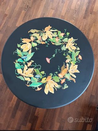 Elegante tavolo rotondo con sfondo nero laccato e splendida decorazione floreale (effetto 3D): Magnolie e Convolvulus. Misure: diametro 115cm spessore 2,3 cm. - Decorazione artistica fatta a mano con esclusiva tecnica ispirata alla Pittura di Pietra rinascimentale. - Motivo floreale a ghirlanda. - Superficie lucida che lo rende impermeabile ad eventuali contatti con liquidi (non adatto ad ambienti esterni e umidi) - si abbina perfettamente a design moderno, contemporaneo o classico.