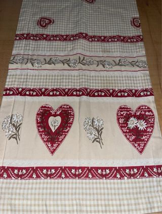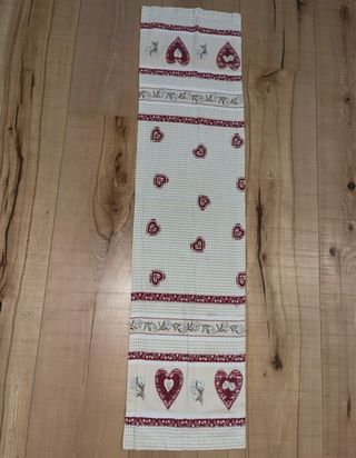 Elegante runner da tavola con un motivo a quadretti e cuori rossi. - Misure: 35x142 cm - Design con cuori e decorazioni floreali - Adatto per dare un tocco di colore alla tavola