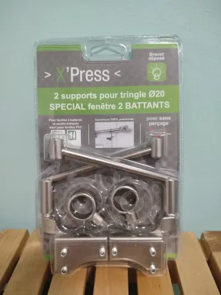 Confezione da 2 supporti per barra tenda X'Press, ideali per finestre a due ante. Progettati per barre di Ø20 mm. Consentono un'apertura del 100% della finestra. Installazione senza necessità di forare (pose sans perçage). Adatti per finestre in PVC.