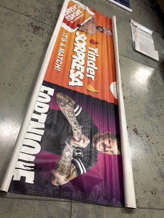 Tela in PVC resistente e duratura, ideale per uso esterno. Il materiale la rende impermeabile. Dimensioni: 3,67 metri di larghezza per 1,78 metri di altezza. Una faccia stampata e una faccia bianca.