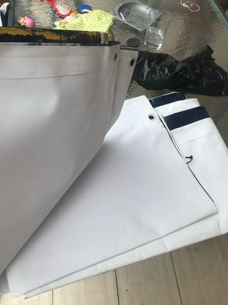 Tela impermeabile in PVC con dimensioni di 3,25 per 3,20 metri. Materiale resistente. Colore bianco. Una delle facciate ha alcune lettere stampate.