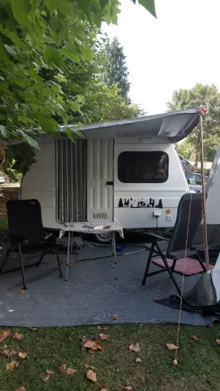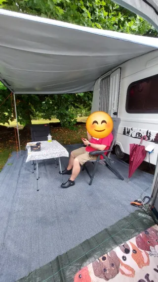Tenda per roulotte, ideale per proteggere dal sole e dalla pioggia. Realizzata in PVC resistente. Colore grigio e bianco.
