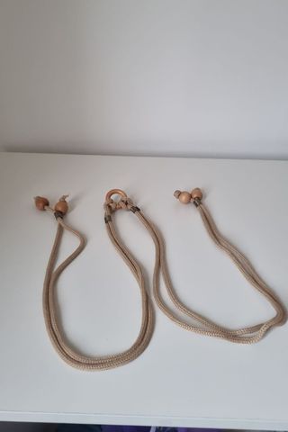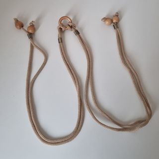 Embrasse fermatenda artigianale in corda intrecciata e legno naturale, perfetta per uno stile shabby chic o boho. CARATTERISTICHE: ►Quantità: 1 pezzo ►Lunghezza totale: 140 cm ►Materiale: Corda tessile intrecciata beige + elementi in legno naturale ►Decorazioni: Perline/sfere in legno naturale, anello in legno centrale, dettagli in metallo anticato/bronzo ►Colore: Beige/naturale/écru ►Stile: Shabby chic, boho, naturale, artigianale ►Sistema: Nodi scorrevoli regolabili con perline decorative alle estremità Condizioni: Usato, buone condizioni generali Utilizzo: Ideale per tende da salotto, camera da letto, cucina