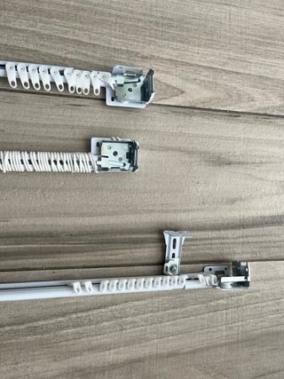 Set di binari per tende con meccanismo a cordino. - Binari in metallo e plastica. - Colore bianco. Binari per tende con sistema a cordino, tipici di tende pieghevoli o pannelli giapponesi. Non sono barre decorative: sono meccanismi interni, con pulegge, cordino e ganci scorrevoli. ✔️ Funzionamento manuale tramite cordino ✔️ Includono ganci/plastiche originali ✔️ Colore bianco ✔️ Ideali per tende pieghevoli o pannelli giapponesi ✔️ Stato: usati, ma funzionano correttamente Misure: – Binari lunghi: 170 cm (misura utile circa 158 cm) – Binari medi: 120 cm – Blocco/meccanismo: 12 cm Si vendono in set a 50€ o separatamente a 20€