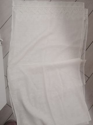 Tenda senza orlo sfrangiata in fondo ,colore bianco non ha un dritto e rovescio, le bacchette vanno inserite nei buchini,lunghezza 1,50 x larghezza 62 cm.Le puoi adattare anche a finestre più corte tagliandole semplicente con una forbice.Disponibili 4 pezzi.il prezzo è di 5 euro l una.
