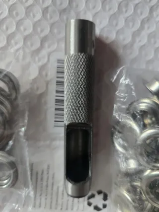 Occhielli in metallo: Kit di anelli robusti con finitura cromata/argento, completi di guarnizioni (rondelle) per un fissaggio sicuro e duraturo. Punzonatrice a fustella: Strumento in acciaio con impugnatura zigrinata antiscivolo. Indispensabile per forare il tessuto in modo netto e preciso prima dell'applicazione dell'anello. Stato: Il prodotto è nuovo, mai utilizzato, ancora nella confezione originale. Caratteristiche principali: Materiale resistente: Metallo di alta qualità resistente all'ossidazione. Facilità d'uso: La punzonatrice inclusa permette di preparare il foro della misura esatta degli anelli senza sforzo. Versatil