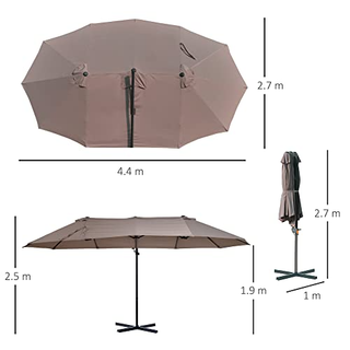 COPERTURA TOTALE: Questo ampio ombrellone largo 4.45m con diametro 2.7m è perfetto per riparare dal sole ampi spazi. Ad esempio, è la soluzione ideale per bar e ristoranti con tavolini all'aperto, per piscine e solarium. IMPERMEABILE: Grazie al tettuccio in poliestere marrone, il tuo ombrellone ti protegge dai raggi UV, non si scolorisce ed è impermeabile. Questo materiale, infatti, è perfetto per l'uso esterno e ti garantisce un prodotto robusto e destinato a durare negli anni. STRUTTURA RESISTENTE: La struttura dell'ombrellone è realizzata in metallo antiruggine ed è dotata di un sistema di 12 stecche di supporto e di una base a c