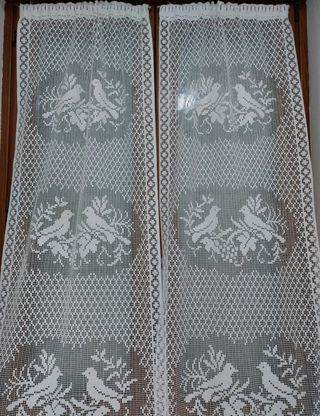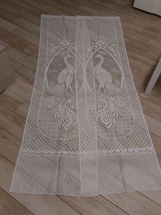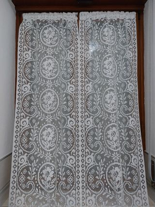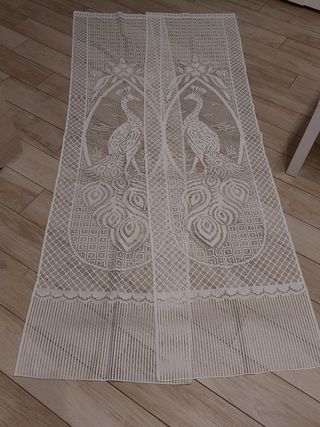 2 Tende in pizzo bianco. Misure: 36x267 cm. In fondo c'è un pizzo ricamato a mano.