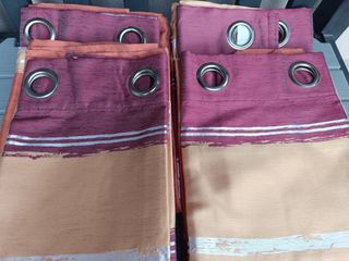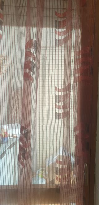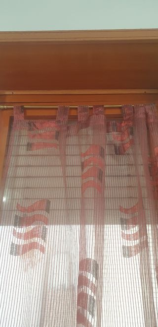 Due tende in tessuto leggero, perfette per dare un tocco di colore alla tua casa. Sono di colore bordeaux con un delicato motivo geometrico. Dimensioni 280x130