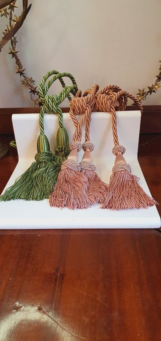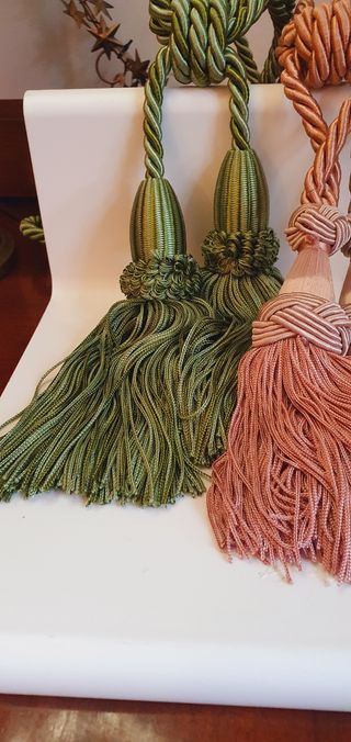 Bellissime passamanerie per tende, perfette per aggiungere un tocco di eleganza alla tua casa. Sono realizzate in tessuto di alta qualità e presentano colori delicati e raffinati. - Il set include due passamanerie, una verde oliva e una rosa. - Sono in ottime condizioni. - Ideali per tende di varie dimensioni.