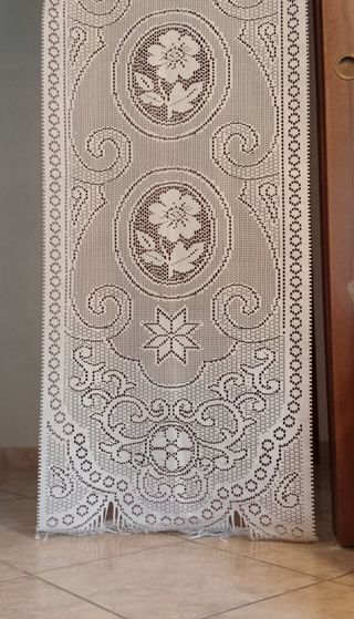 2 Tende in pizzo elasticizzato con un delicato motivo floreale, fatte a mano. Montate mi sono accorta che le misure erano sbagliate. 61x160 cm. Particolari e belle. Si possono usare anche come sciarpe - Motivo floreale multicolore su base bianca.