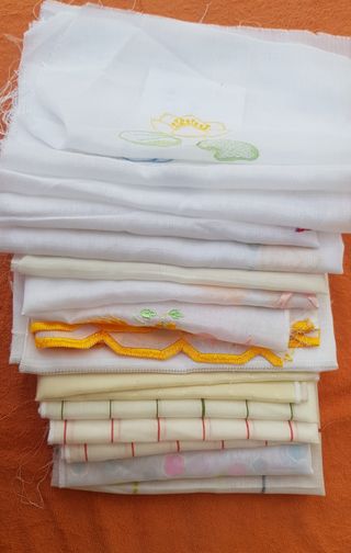 Bellissimi tessuti in poliestere e cotone, perfetti per realizzare creazioni uniche. Sono inclusi 12 pezzi di stoffa, alcuni con ricami delicati. Ideali per tende, tovaglie o altri progetti fai da te. - Misure variabili - Colori: bianco e giallo - Perfetti per progetti di cucito creativo