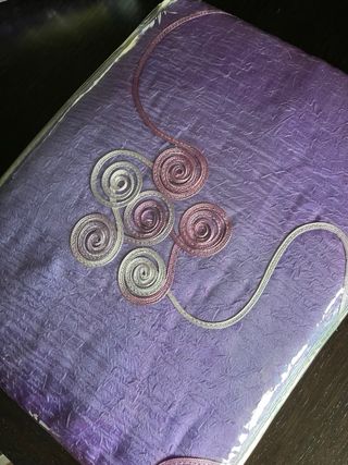 Set di due tende per porta balcone, in tessuto con un elegante motivo a ricamo. - Colore viola. - Doppio velo. - Motivo decorativo a spirale.
