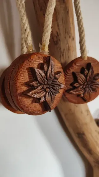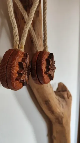 Deliziosi fermatende in legno di larice, a forma di stella alpina. Perfetti per aggiungere un tocco rustico e naturale alla tua casa,completi di magnete e corda,realizzati a mano da artigiano del legno in Valle d'Aosta,regione del nord Italia. Nuovi,condizioni perfette. - Realizzati in legno di larice. - Design a forma di stella alpina intagliata. - Venduti in coppia.