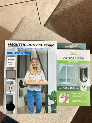 Set di zanzariere per porte e finestre, nuove e mai usate. - Zanzariera per porta: 100 x 210 cm. - Zanzariera per finestra: 150 x 180 cm. - Facili da applicare con nastro a strappo. - La zanzariera per finestra può essere tagliata su misura.