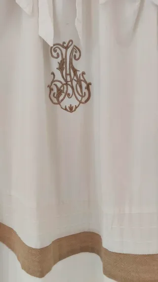 Tenda a un pannello in puro cotone, colore bianco con bordo e monogramma beige/ecrù. Trattasi di biancheria per la casa francese i tre monogrammi - fatti a macchina - sono in stile francese. La tenda ha un apertura centrale e laccetti per essere appesa. Misure: Larghezza 130 cm Altezza 200 cm Altezza bordo compresa l'applicazione ecrù 54 cm