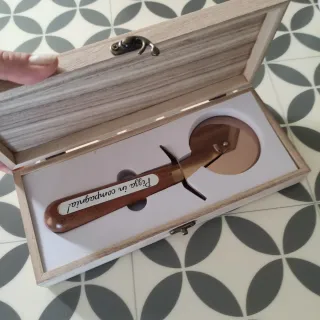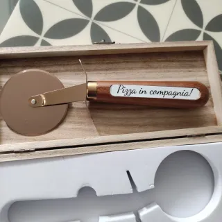Un elegante tagliapizza con manico in legno e dettagli ramati. - Lama in metallo. - Manico in legno con scritta Pizza in compagnia!. - Custodia in legno inclusa.