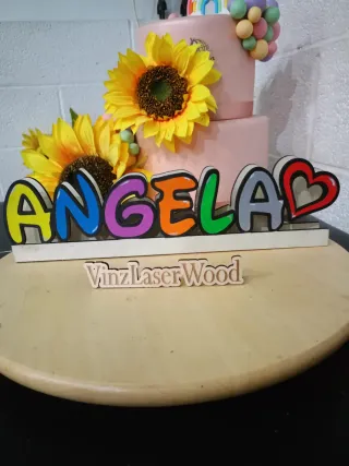 Lampada da tavolo personalizzata con nome. - Realizzata in legno intagliato ed inciso - Design colorato e vivace. - dipinta a mano - illuminazione a led bianchi - funziona a batteria