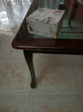 Elegante tavolino da salotto con un design vintage. - Piano in vetro trasparente. - Struttura in legno scuro. - Gambe intagliate per un tocco classico. 120 cm lunghezza X 60 cm larghezza