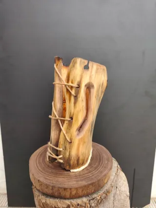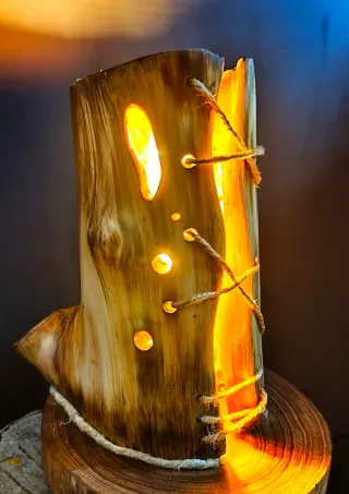 Lampada unica realizzata a mano con un tronco d'albero. La luce calda che filtra attraverso le aperture crea un'atmosfera suggestiva. - Design rustico e naturale. - Dettagli decorativi in corda. - Base in legno massello.